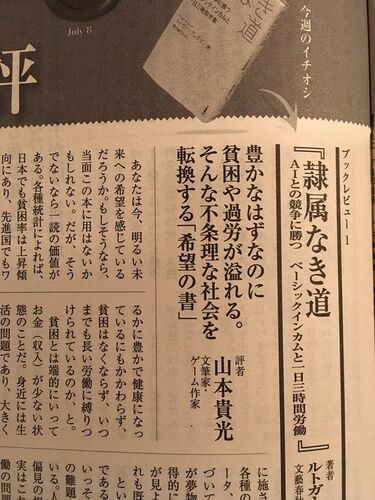 『週刊現代』7月8日号(講談社)に書評を寄稿しました。 評したのは、ルトガー・ブレグマン『隷属なき道――AIとの競争に勝つ ベーシックインカムと一日三時間労働』(野中香方子訳、文藝春秋)です。 貧困の問題を解決するには、ベーシックインカムと労働時間…